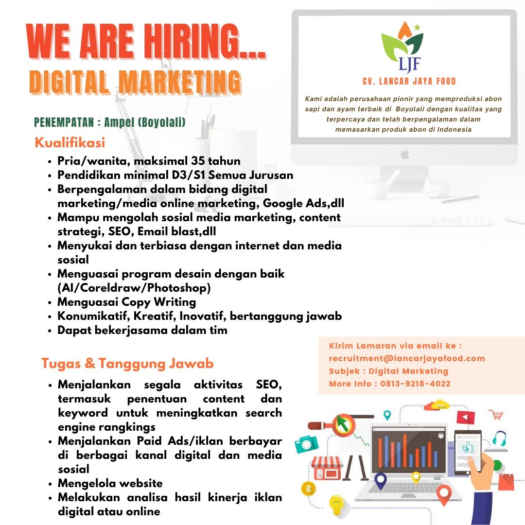 Sekarang CV. Lancar Jaya Food sedang membuka lowongan kerja untuk posisi sebagai digital marketing dengan kualifikasi sebagai berikut:?