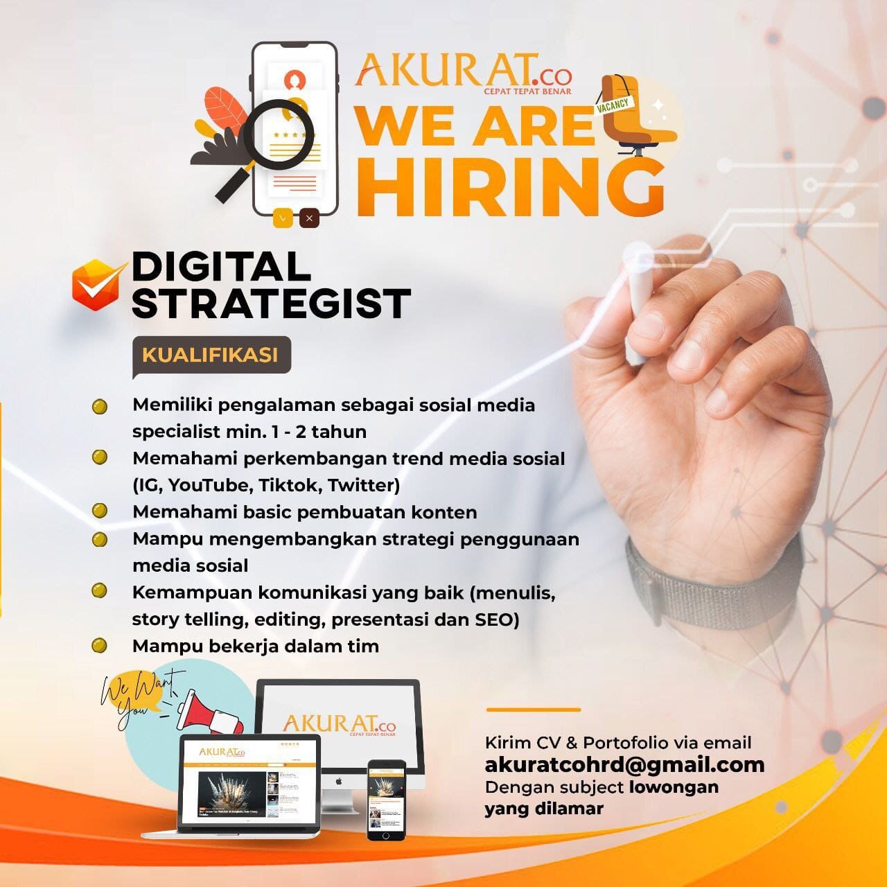 Jika anda berminat dengan lowongan pekerjaan sebagai digital strategis di Akurat.co ini, maka segera kirim CV & Portofolio via