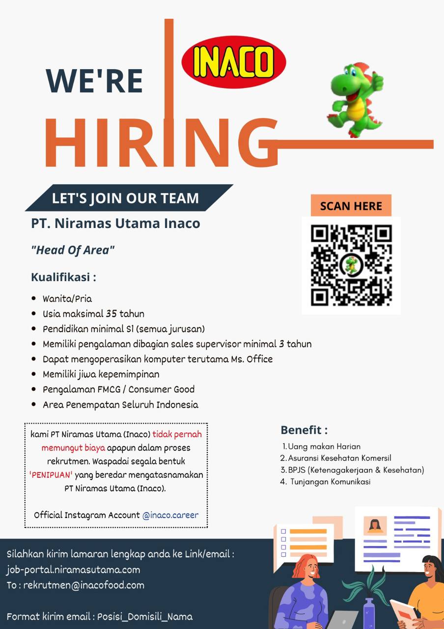 Saat ini PT. Niramas Utama Inaco sedang membuka lowongan kerja Head Of area dengan kualifikasi sebagai berikut :?