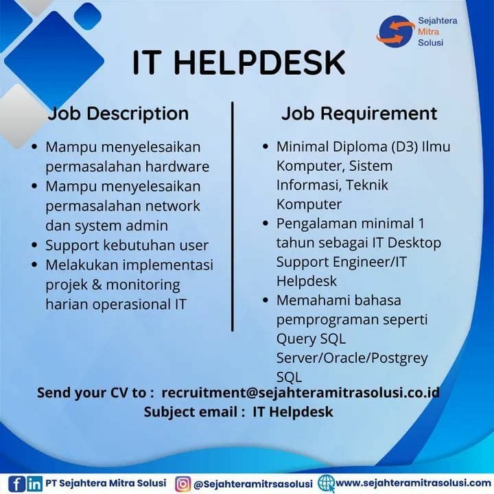 PT. Sejahtera Mitra Solusi saat ini sedang membuka lowongan kerja untuk posisi sebagai "IT HELPDESK" dengan persyaratan sebagai berikut :