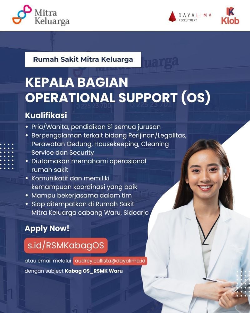 Saat ini Rumah Sakit' Mitra Keluarga sedang membuka lowongan kerja kepala bagian operational support ( os ) dengan kualifikasi sebagai berikut?