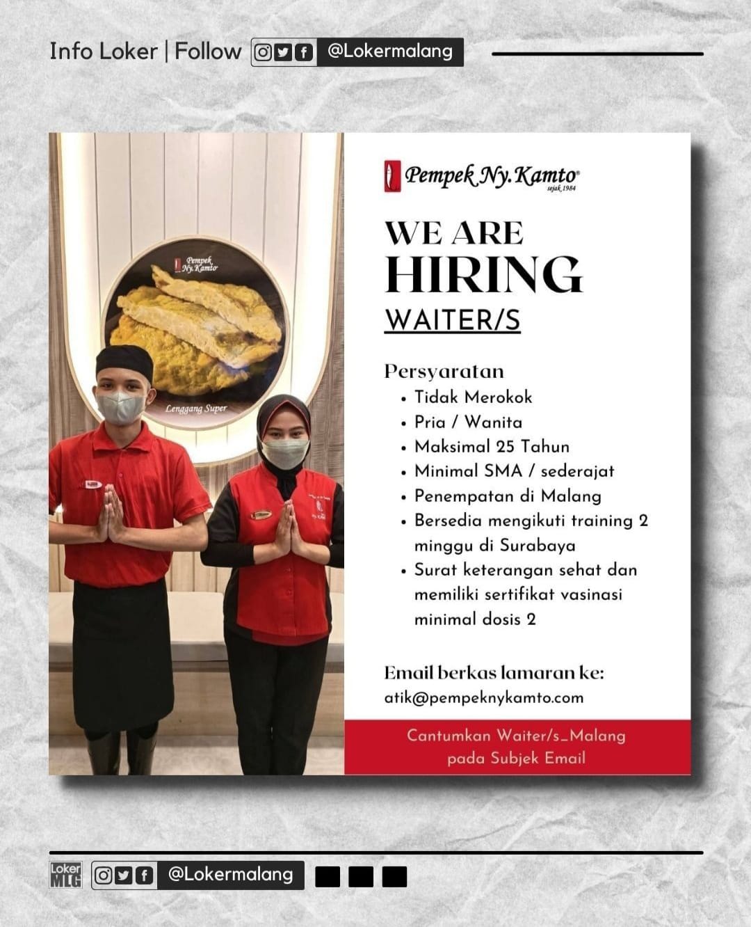 Saat ini Pempek Ny. Kanto sedang membuka lowongan kerja waiters dengan persyaratan sebagai berikut :?