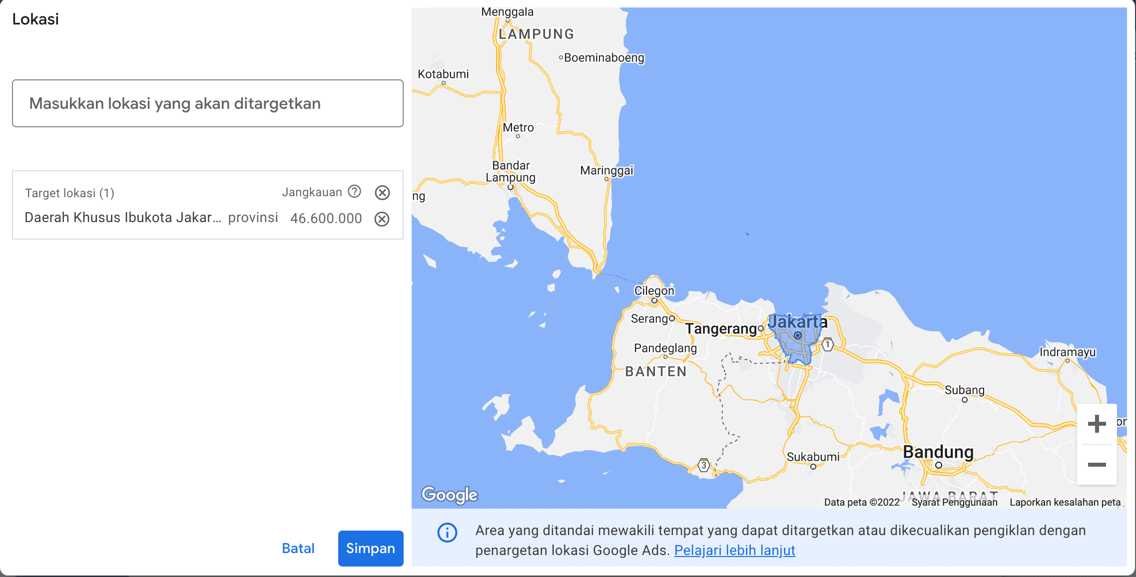 Pada contoh di bawah ini, lokasi pencarian terbatas pada wilayah Jakarta. Google juga akan memberi tahu Anda berapa banyak orang yang ada di wilayah itu. Dalam hal ini, 46,6 juta: