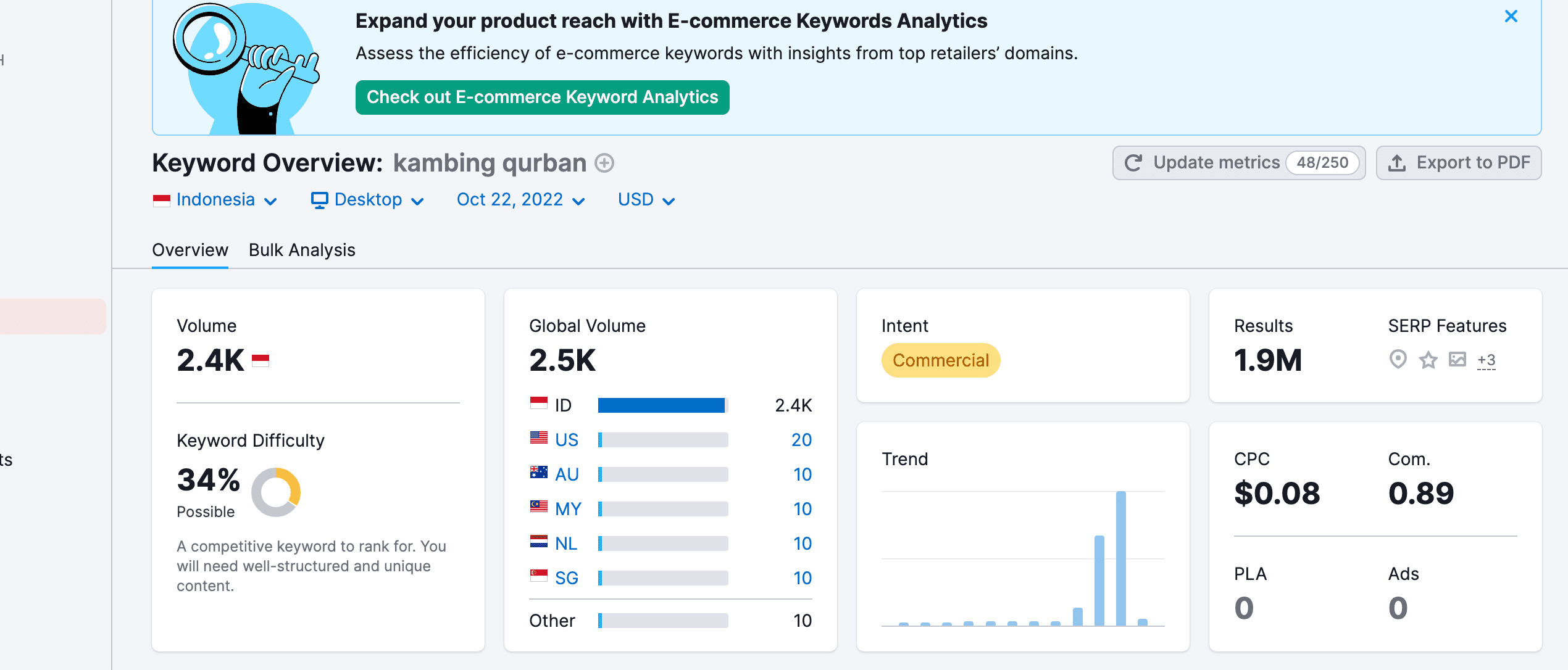 Pada alat Keyword Overview, kita dapat melihat bahwa pencarian kata kunci ini cenderung meningkat menjelang bulan Haji, terutama sekitar bulan Dzulhijjah: