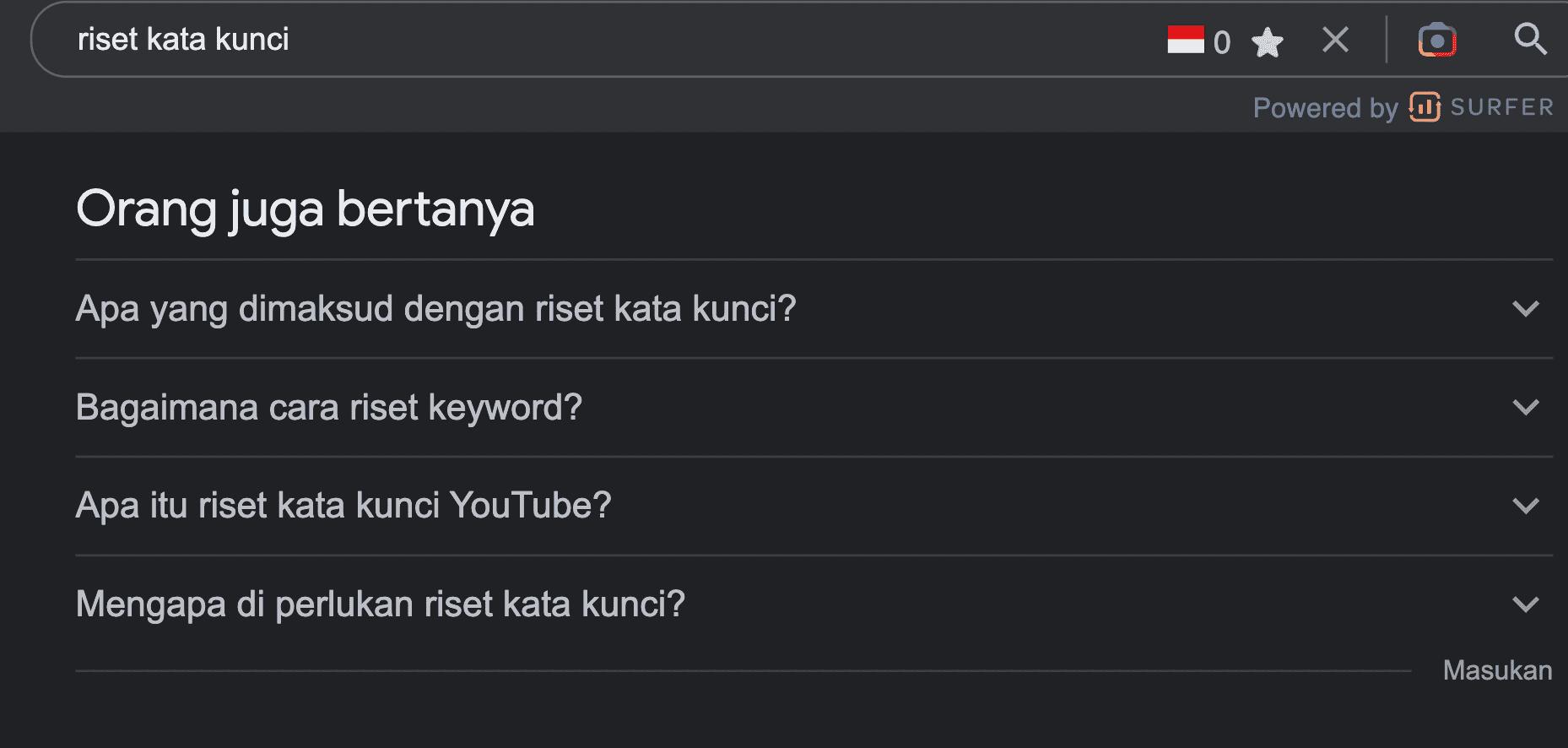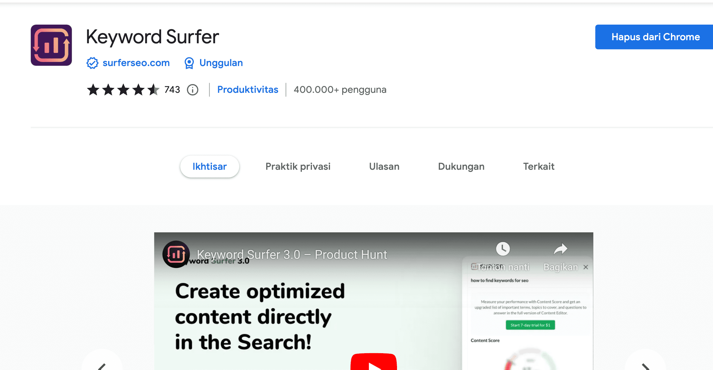 Keyword Surfer merupakan ekstensi browser untuk Chrome yang menampilkan tingkat kemiripan keyword serta volume pencarian untuk keyword tersebut. Anda bisa mengunduhnya di keyword surfer