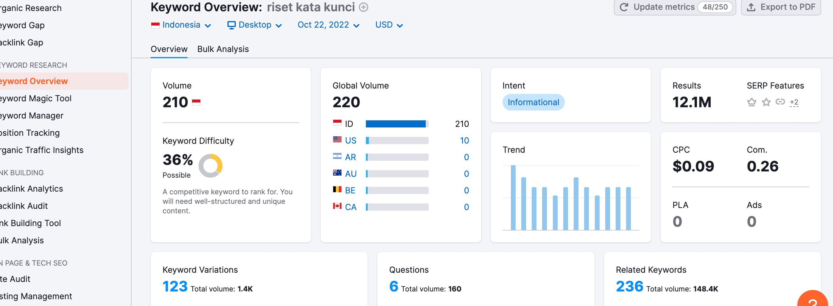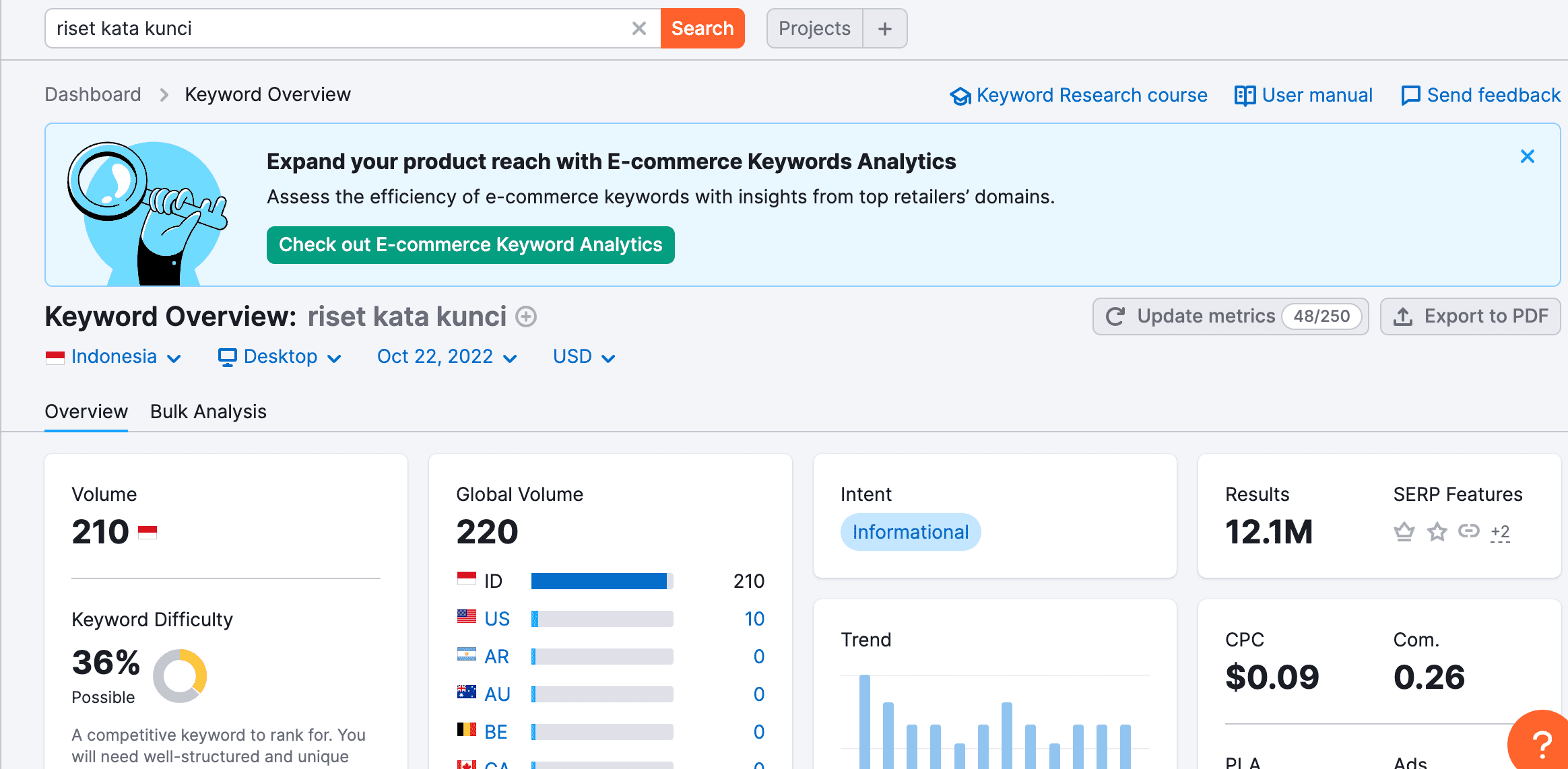 Banyak alat di Semrush Keyword Research suite menampilkan volume setiap kata kunci?cari kolom ?Volume?. Untuk melihat secara mendalam volume pencarian kata kunci, gunakan tool keyword overview . Tool keyword overview dapat menunjukkan kepada Anda volume lokal dan global kata kunci: