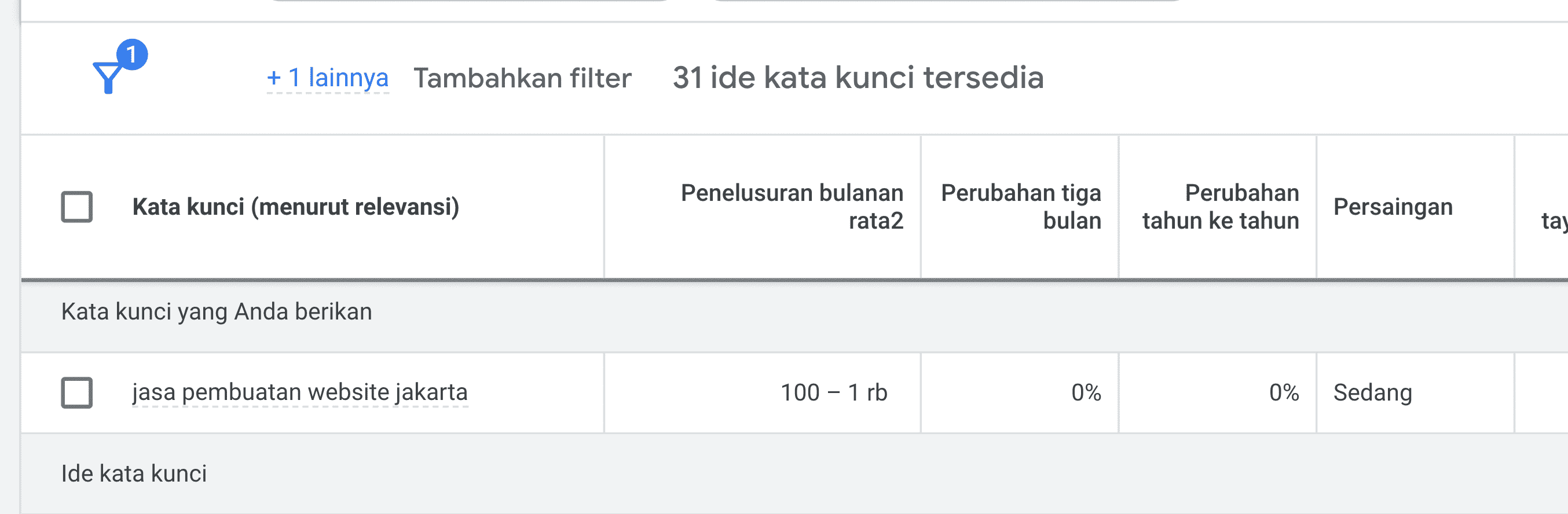 Setelah lokasi ditetapkan ke target, Di sini Anda dapat melihat volume pencarian untuk kata kunci di lokasi yang dipilih. Dalam contoh ini, ?Jasa pembuatan website Jakarta? di wilayah DKI Jakarta memiliki volume rata-rata 100-1000 penelusuran per bulan: