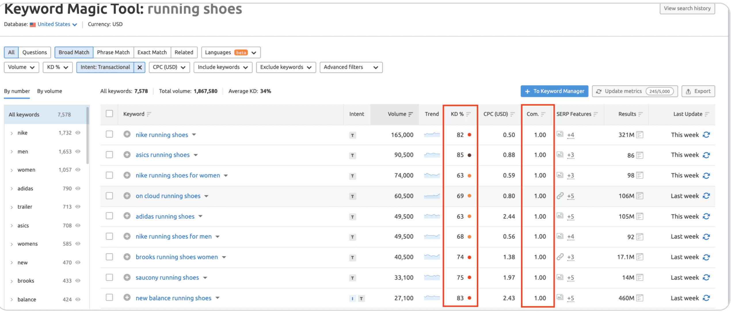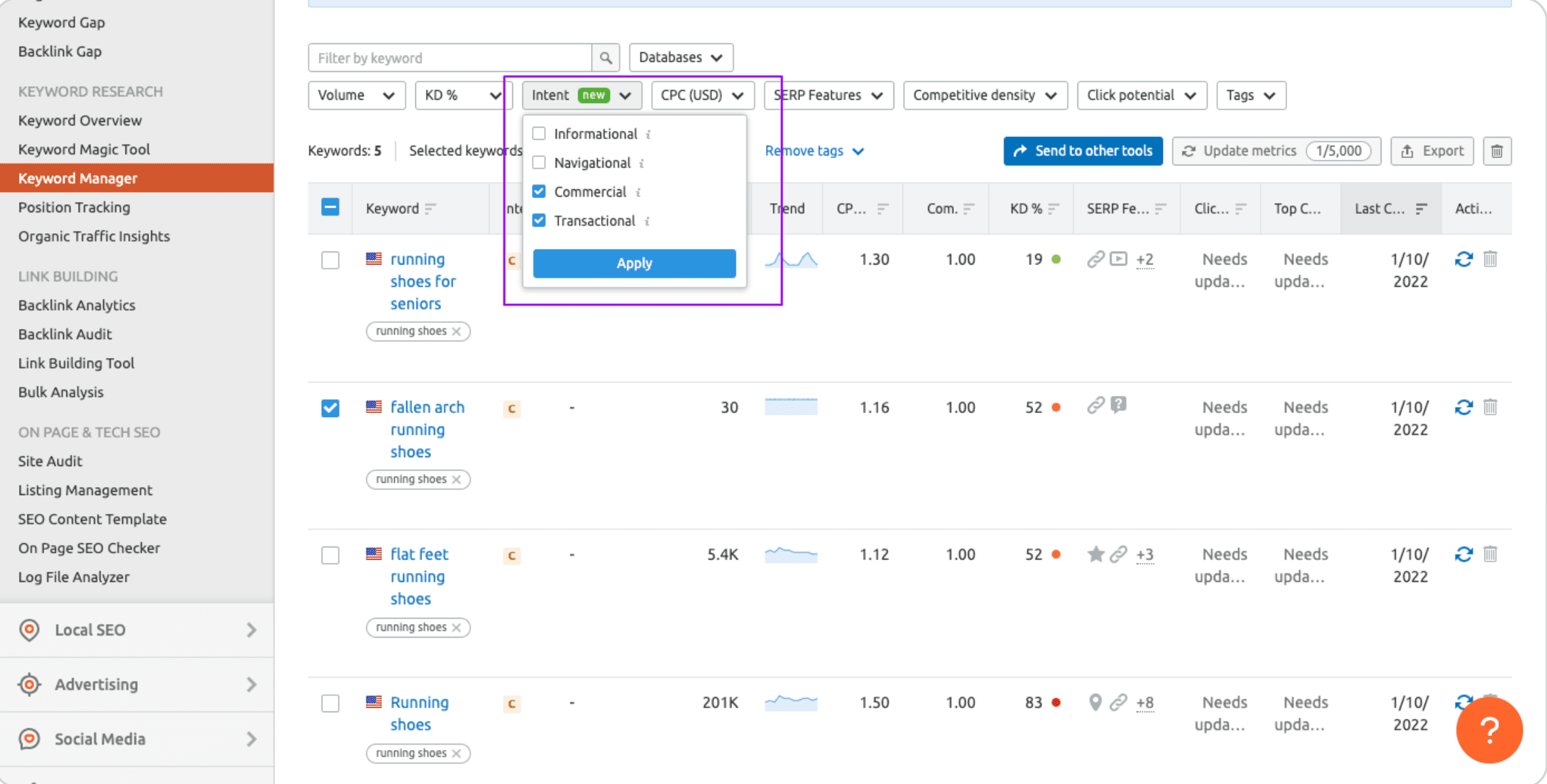 Misalnya, Anda berinvestasi dalam menargetkan kata kunci komersial atau transaksional?yaitu, kata kunci yang digunakan pelanggan saat mereka siap melakukan pembelian. Untungnya, ada opsi pemfilteran untuk mempersempit daftar Anda menjadi hanya kata kunci dengan metrik maksud pencarian.