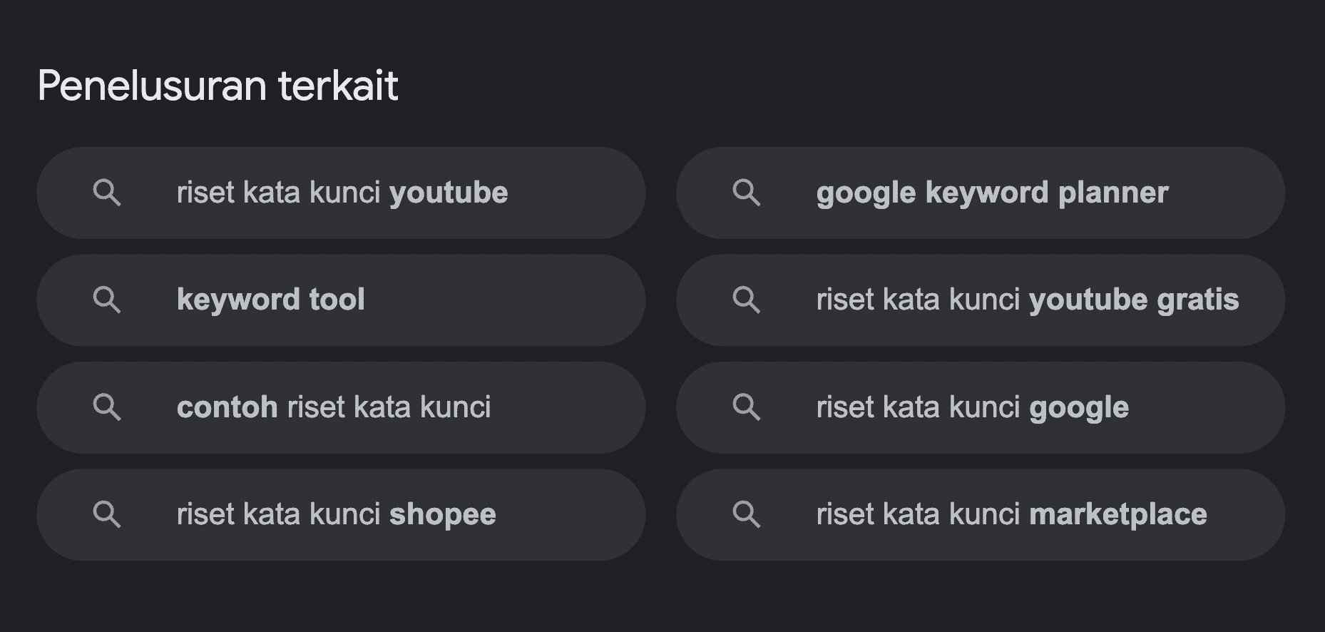 Percaya atau tidak, menggulir ke bagian bawah halaman Google dapat membantu! Anda dapat menemukan daftar ?pencarian terkait? di bagian bawah setiap SERP. Anda juga dapat memasukkan kata kunci ini kembali ke alat kata kunci lainnya untuk menemukan lebih banyak variasi kata kunci.