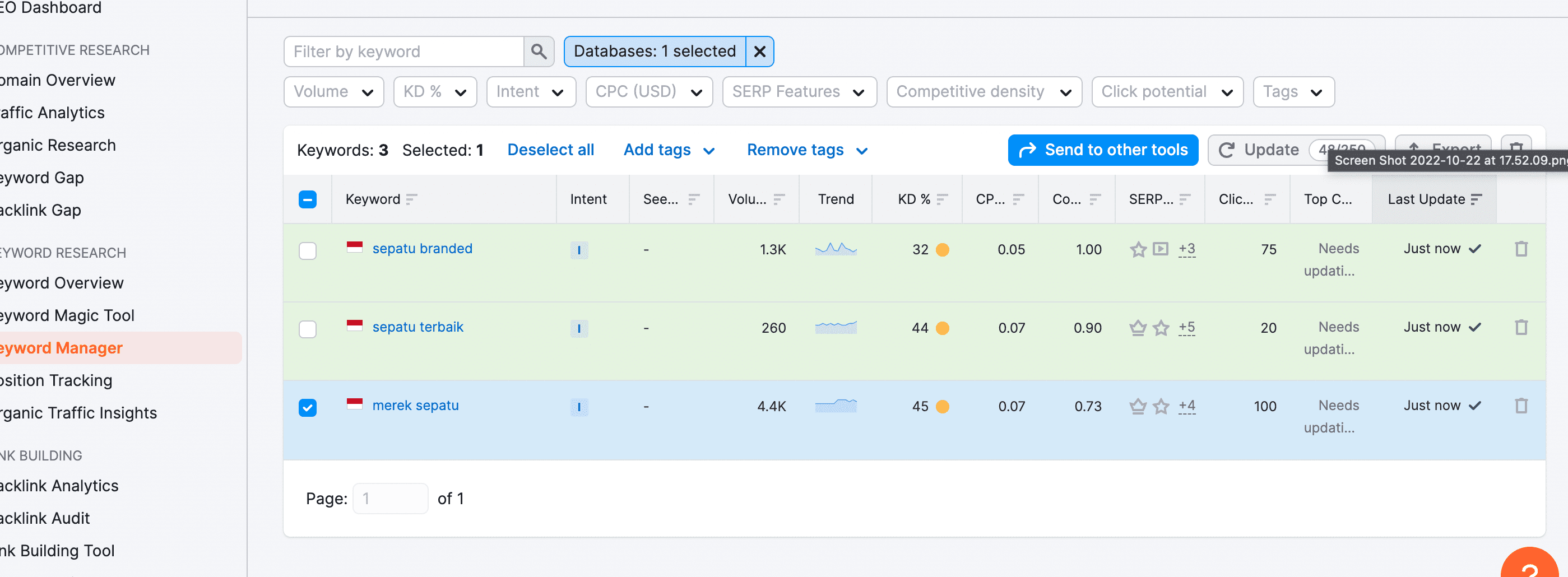 Di alat Pengelola Kata Kunci, Anda dapat memilih untuk menghapus kata kunci dari daftar Anda yang tidak relevan: (Semrush - Keyword Manager)