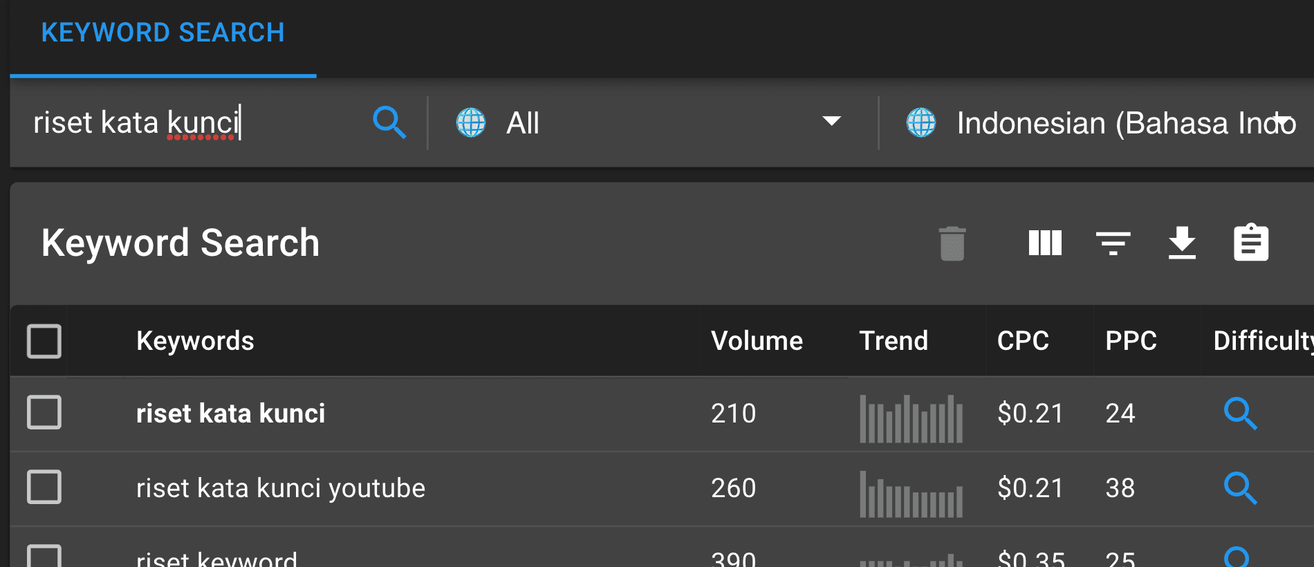 Keyword revelaer menyediakan riset keyword gratis untuk member gratis sebanyak 3x pencarian, hasil pencarian menampilkan volume, trend, CPC, PPC dan tingkat kesulitan keyword
