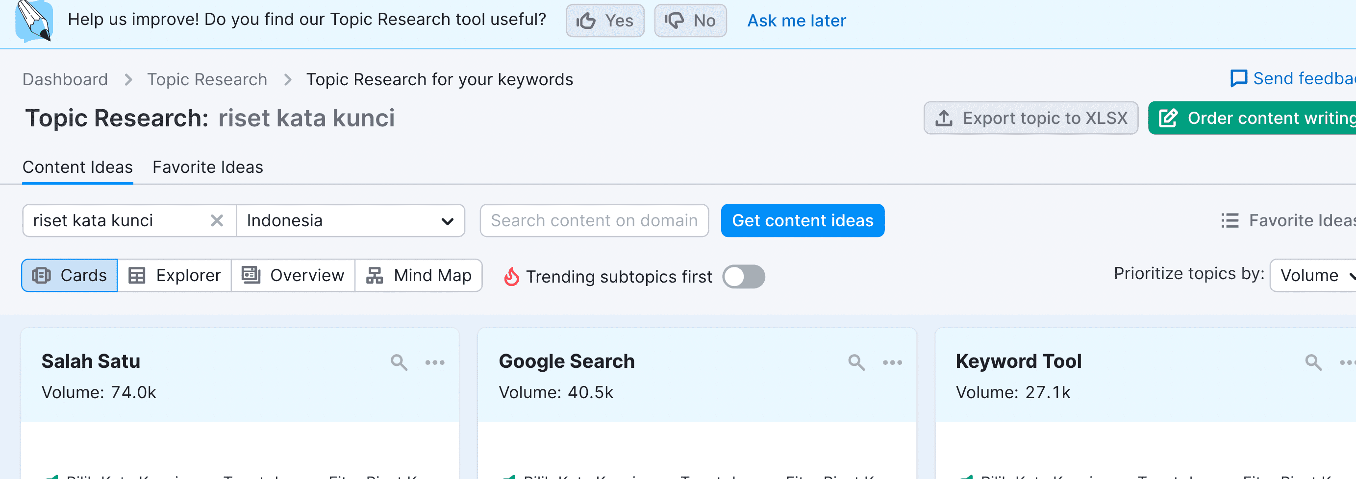 Riset topik atau topic research mengembalikan sekumpulan besar topik dan konsep terkait dalam format berbeda berdasarkan kata kunci tertentu.