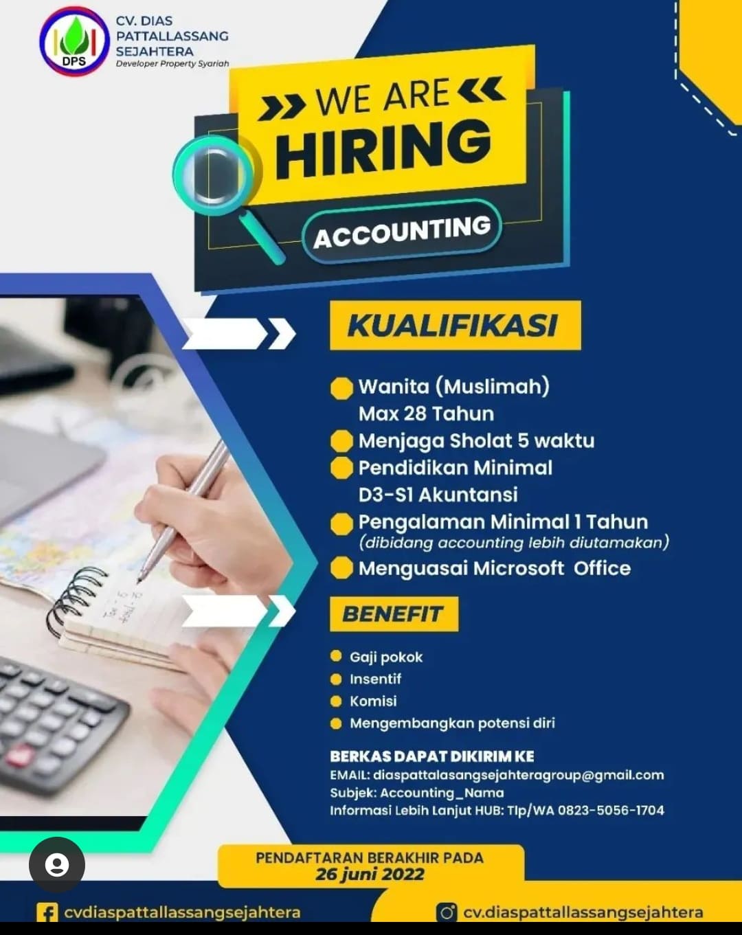 Jika anda berminat dengan lowongan pekerjaan Accounting di DIAS PATTALLASSANG SEJAHTERA ini, segera kirimkan berkas ke email: