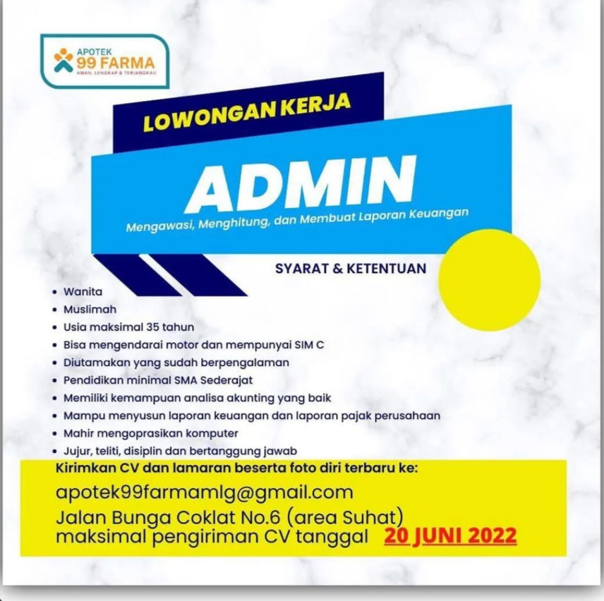 Jika anda berminat dengan lowongan pekerjaan admin di apotek 99 Farma ini, segera kirimkan? CV dan lamaran beserta foto diri terbaru ke: