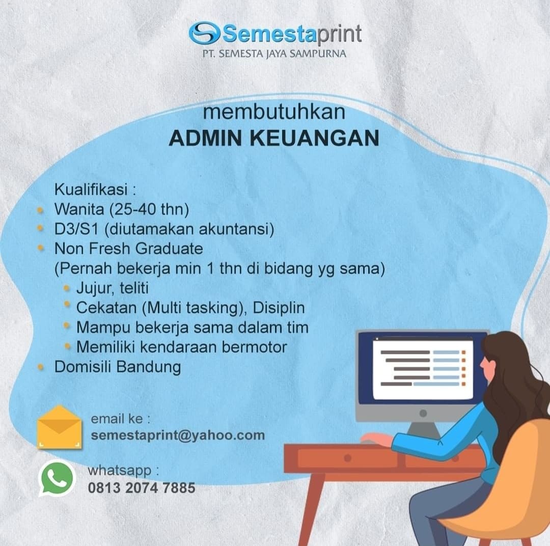 Saat ini PT. Semesta Jaya Sampurna sedang membuka lowongan kerja admin keuangan dengan kualifikasi sebagai berikut :