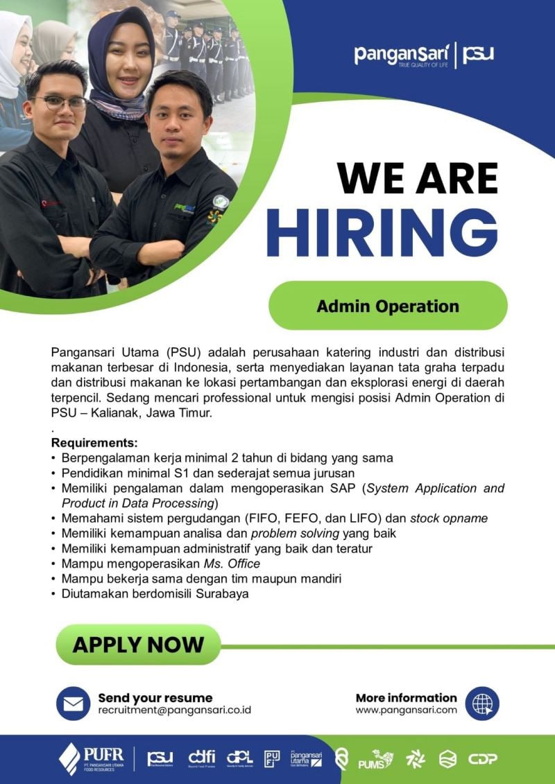 Pangan Sari Utama merupakan perusahaan katering industri dan distribusi makanan terbesar di Indonesia, serta menyediakan layanan tata graha terpadu dan distribusi makanan ke lokasi pertambangan dan eksplorasi energi di daerah terpencil. Sedang mencari professional untuk mengisi posisi Admin Operation di PSU - Kalianak, Jawa Timur.