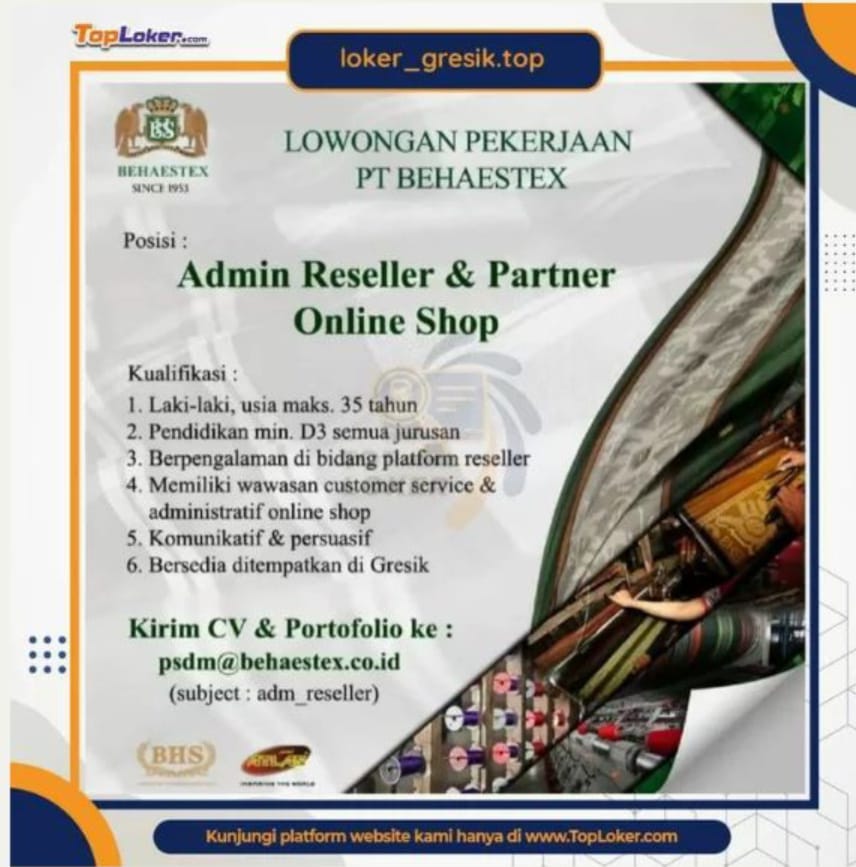 Saat ini PT. Behaestex sedang membuka lowongan kerja admin reseller & partner online shop dengan kualifikasi sebagai berikut :?