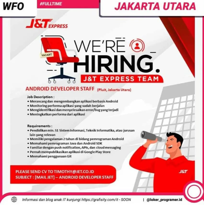 Jika anda berminat dengan lowongan kerja kerja android development di J&T ini, segera kirimkan CV terbaru anda ke email TIMOTHY@JET.CO.ID