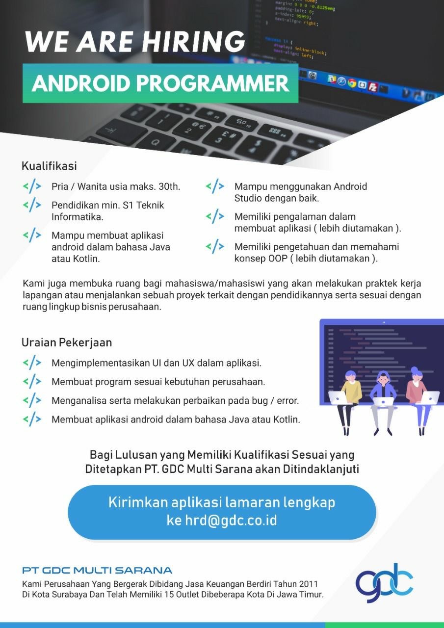 Saat ini PT. GDC Multi Sarana sedang membuka lowongan kerja android programmer dengan kualifikasi sebagai berikut :?