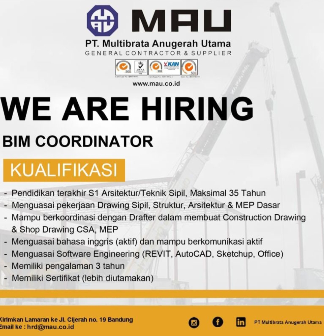 Saat ini PT. Multibrata Anugerah Utama sedang membuka lowongan kerja BIM Coordinator dengan kualifikasi sebagai berikut :?