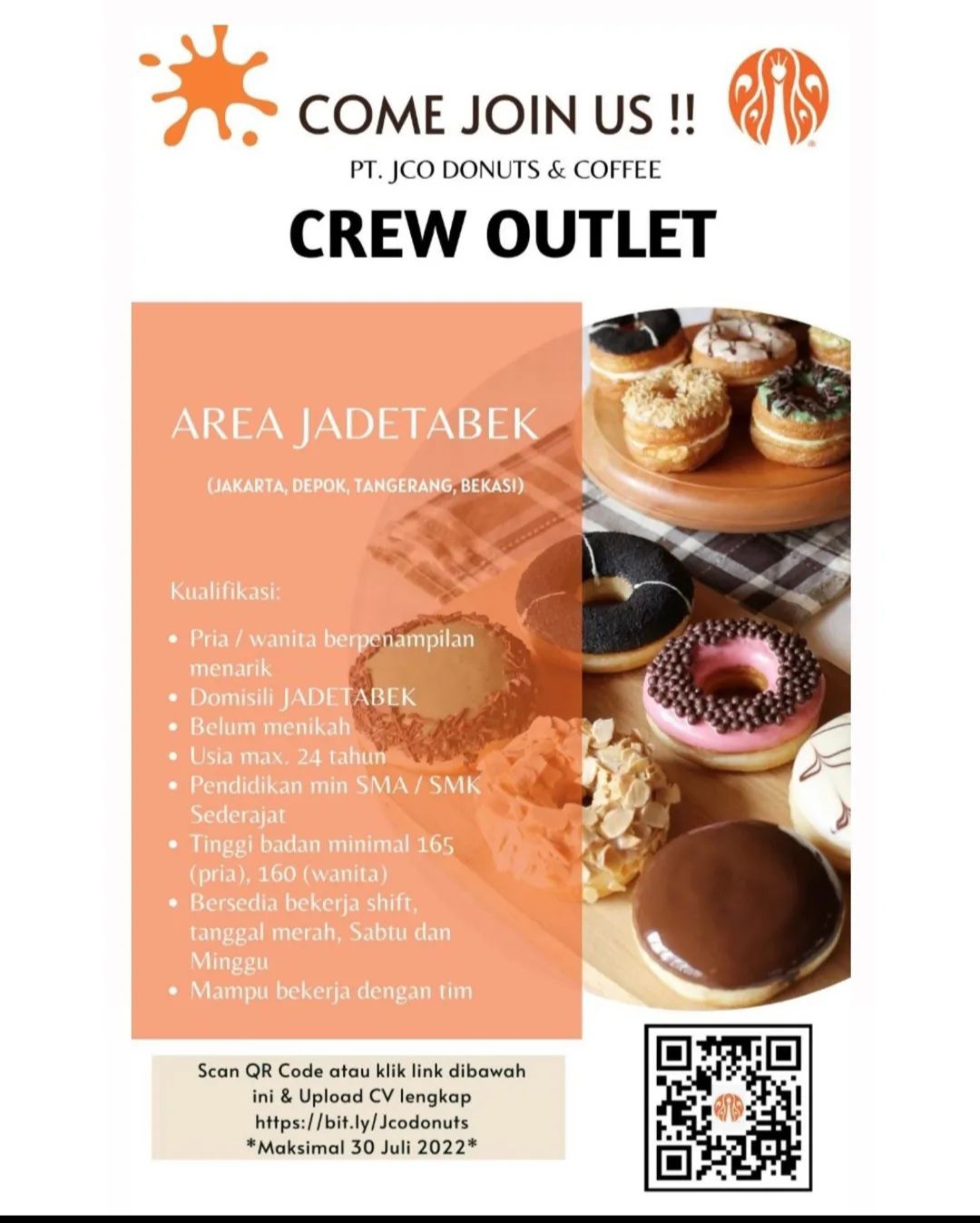 Jika anda berminat dengan lowongan kerja Crew Outlet di PT. JCO Donuts & Coffee ini, segera scan QR Code atau klik link dibawah ini & upload CV lengkap anda : https://bit.ly/Jcodonuts