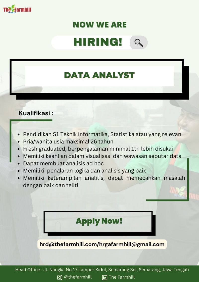 Saat ini The Farm Hill sedang membuka lowongan kerja data analyst dengan kualifikasi sebagai berikut :?
