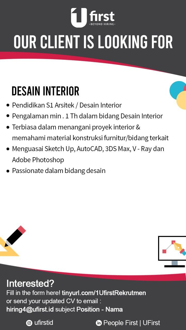 Saat ini Ufirst sedang mencari talenta untuk lowongan kerja sebagai "DESAINER INTERIOR" dengan kualifikasi sebagai berikut :