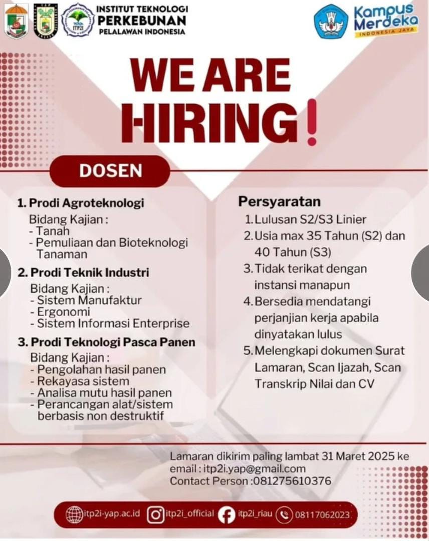 Saat ini Institut Teknologi Perkebunan Pelalawan Indonesia sedang membuka lowongan kerja dosen dengan kualifikasi sebagai berikut :?
