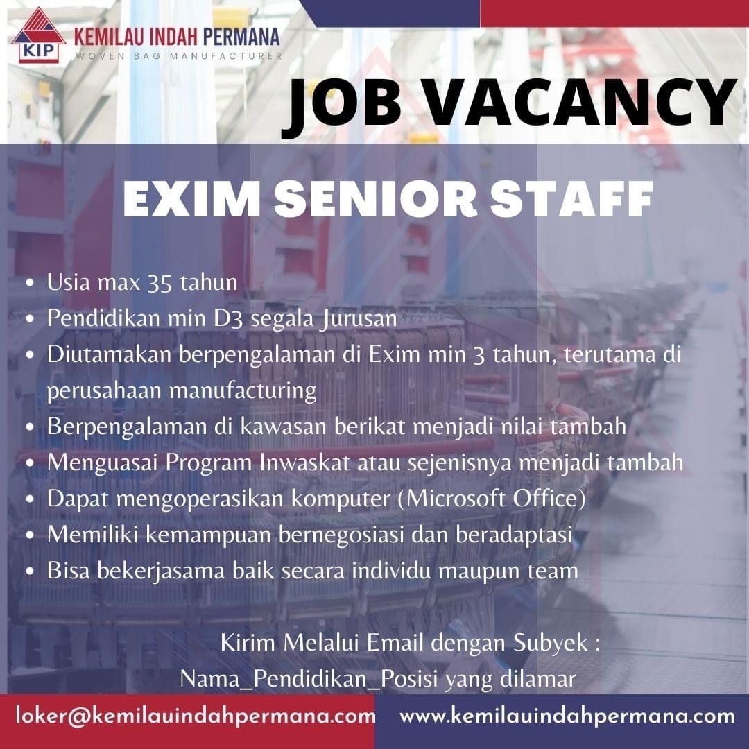 Saat ini PT. Kemilau Indah Permana sedang membuka lowongan kerja Exim Senior Staff dengan kualifikasi sebagai berikut :?