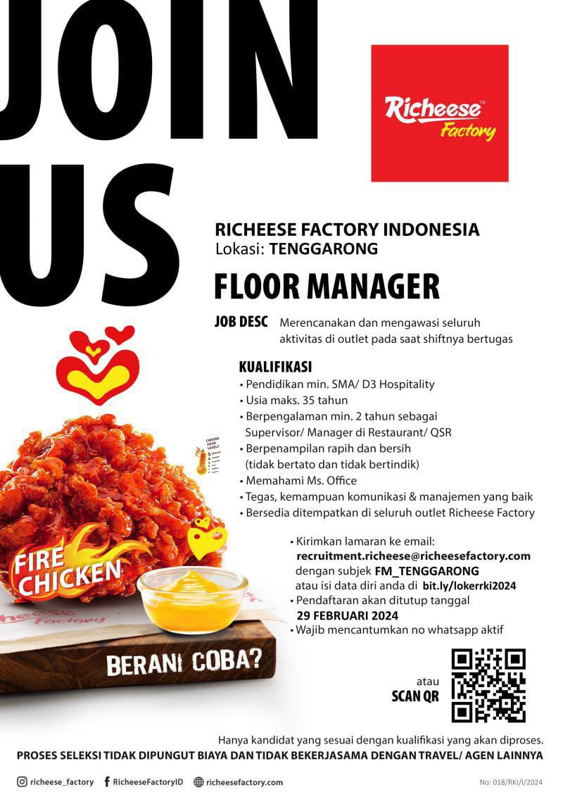Saat ini Richeese Factory sedang membuka lowongan kerja floor manager dengan kualifikasi sebagai berikut :?