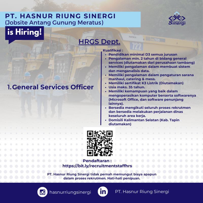 Saat ini PT. Hasnur Riung Sinergi sedang membuka lowongan pekerjaan general services officer dengan kualifikasi sebagai berikut :?