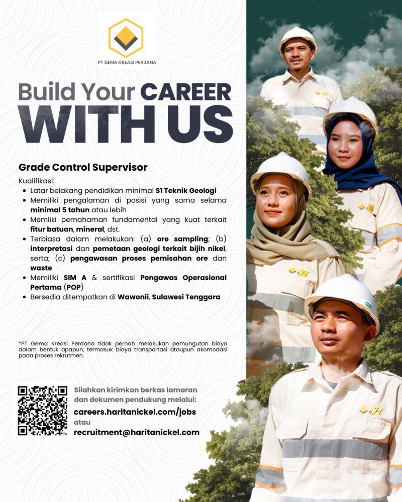 Saat ini PT. Gema Kreasi Perdana sedang membuka lowongan kerja grade control supervisor dengan kualifikasi sebagai berikut :?