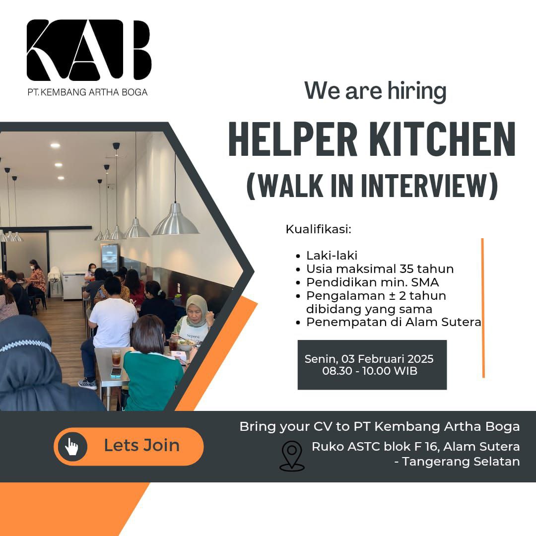 Saat ini PT. Kembang Artha Boga sedang membuka lowongan kerja helper kitchen dengan kualifikasi sebagai berikut :?