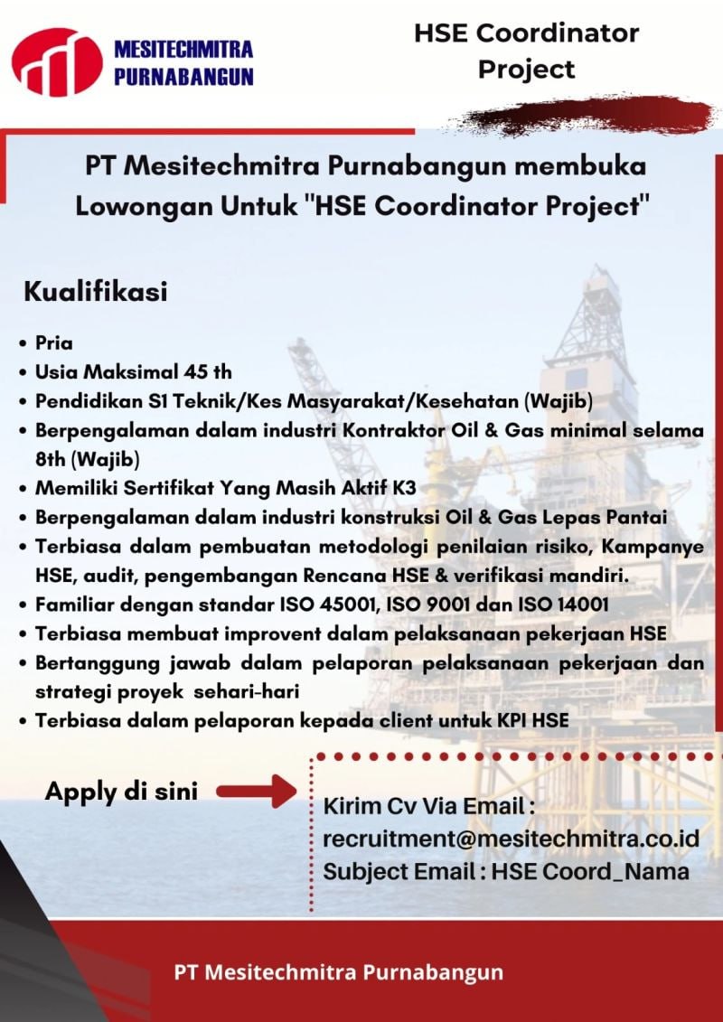Saat ini PT. Mesitechmitra Purnabangun sedang membuka lowongan kerja HSE Coordinator Project dengan kualifikasi sebagai berikut :?