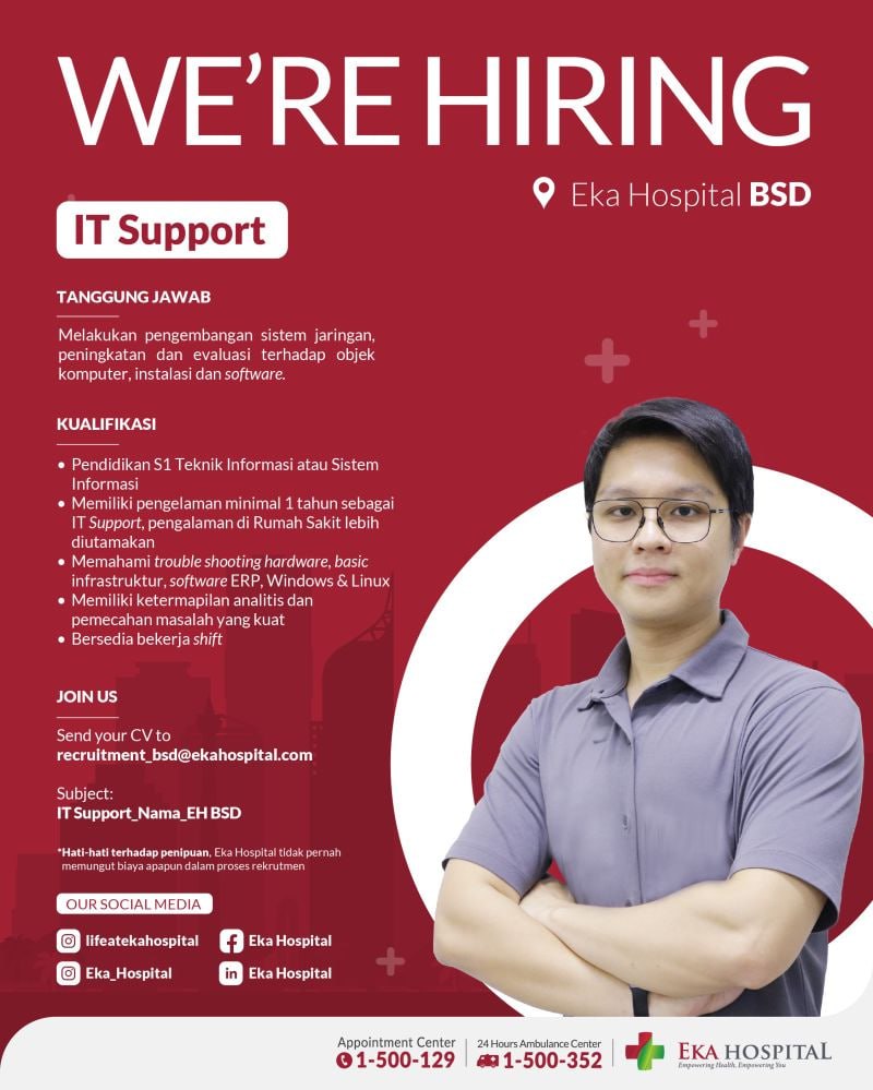 Saat ini Eka Hospital BSD sedang membuka lowongan kerja IT Support dengan kualifikasi sebagai berikut :?