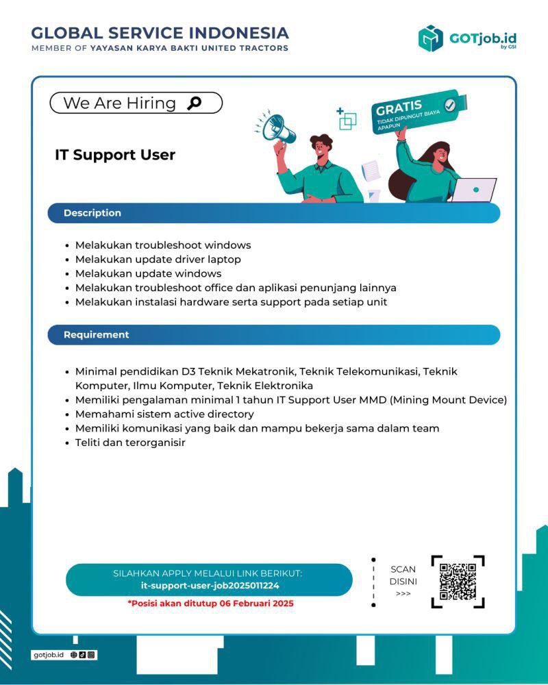 Saat ini Global Service Indonesia sedang membuka lowongan kerja IT support User dengan kualifikasi sebagai berikut :?