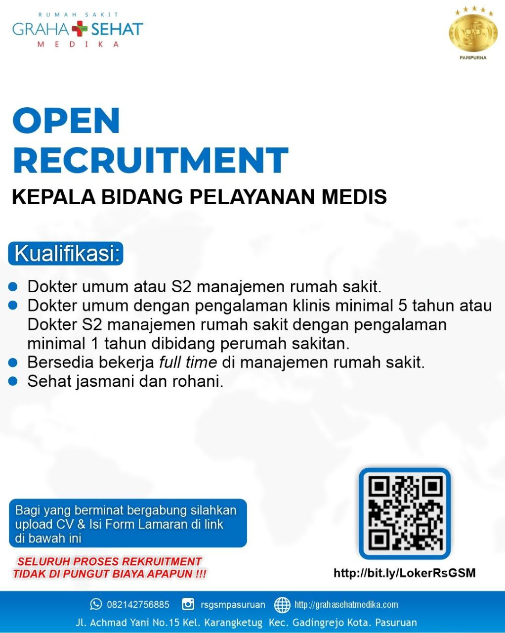 Saat ini Rumah Sakit Graha Sehat Medika sedang membuka lowongan kerja kepala bidang pelayanan medis dengan kualifikasi sebagai berikut :?