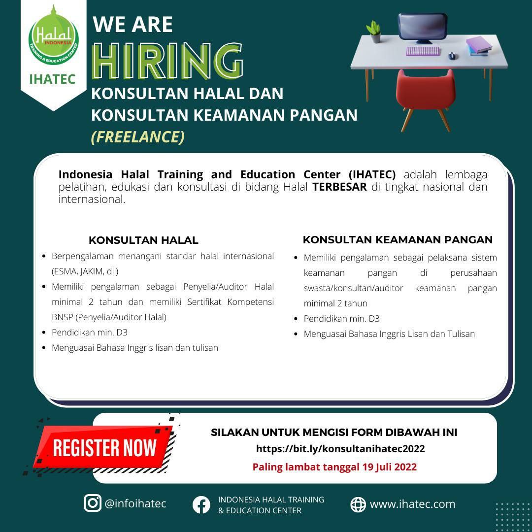 Saat ini IHATEC sedang membuka lowongan kerja konsultan halal dan konsultan keamanan pangan ( freelance ) dengan kualifikasi sebagai berikut: