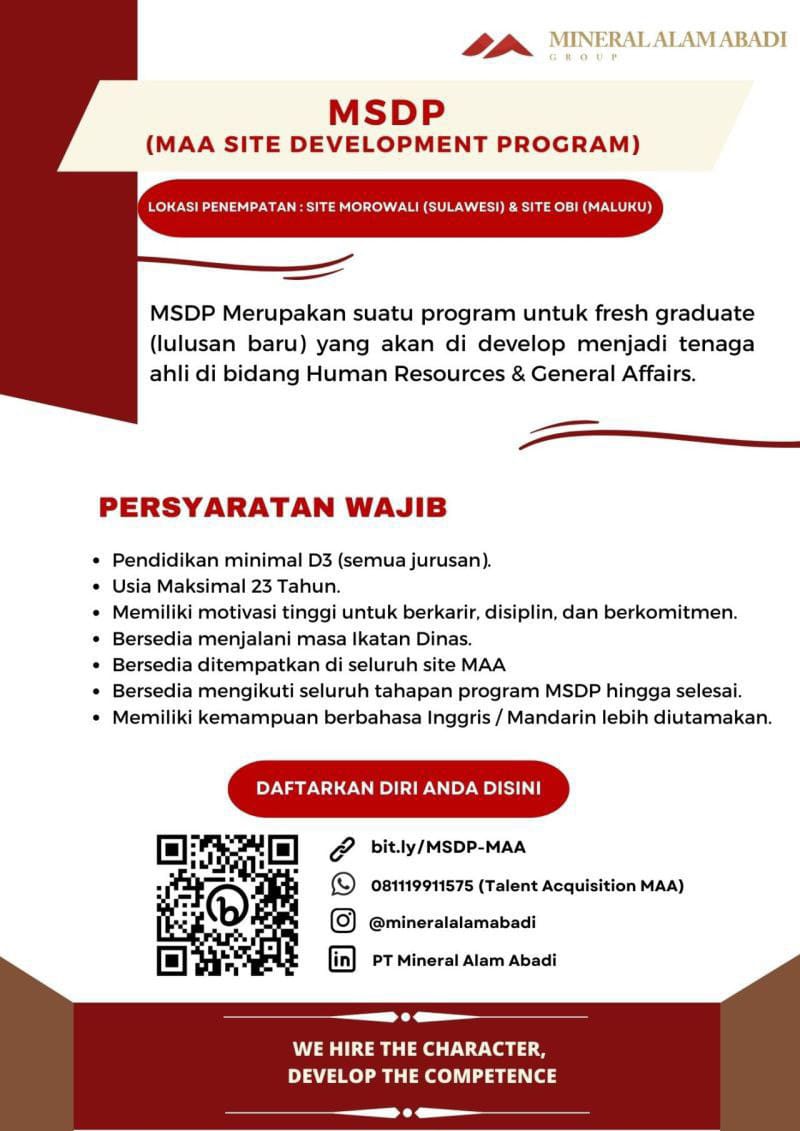 Saat ini Mineral Alam Abadi Group sedang membuka lowongan kerja MSDP dengan kualifikasi sebagai berikut :?
