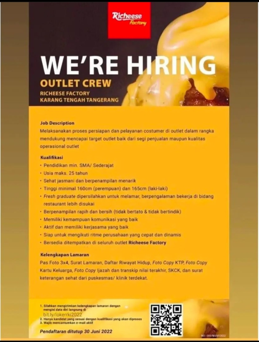 Saat ini Recheese sedang membuka lowongan pekerjaan untuk menempati posisi sebagai outlet Crew dengan kualifikasi sebagai berikut:?
