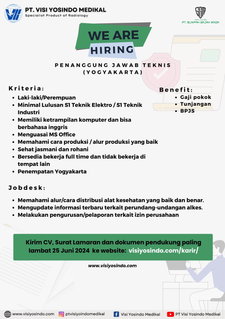 Saat ini PT. Visi Yosindo Medikal sedang membuka lowongan kerja penanggung jawab teknis dengan kualifikasi sebagai berikut :?
