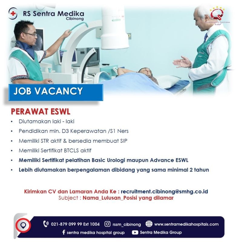 Saat ini RS Sentra Medika sedang membuka lowongan kerja perawat ESWL dengan kualifikasi sebagai berikut :?