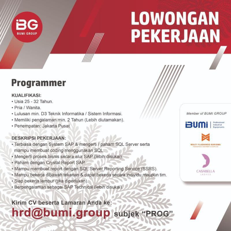 Saat ini PT. Bumi Group sedang membuka lowongan kerja programmer dengan kualifikasi :?