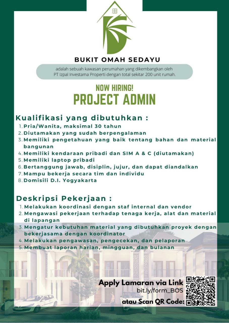Saat ini Bukit Omah Sedayu sedang membuka lowongan kerja project admin dengan kualifikasi sebagai berikut :?