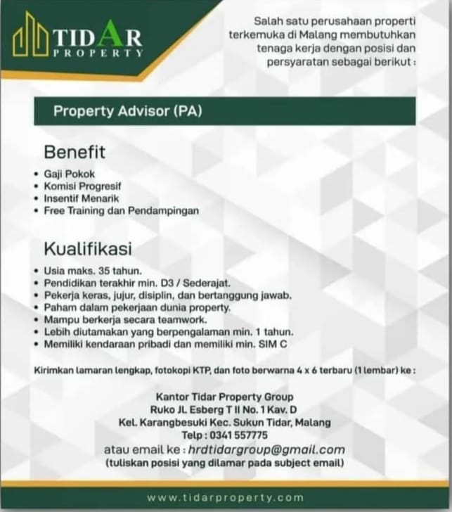 Saat ini tidar property sedang membuka lowongan kerja property advisor dengan kualifikasi sebagai berikut :?