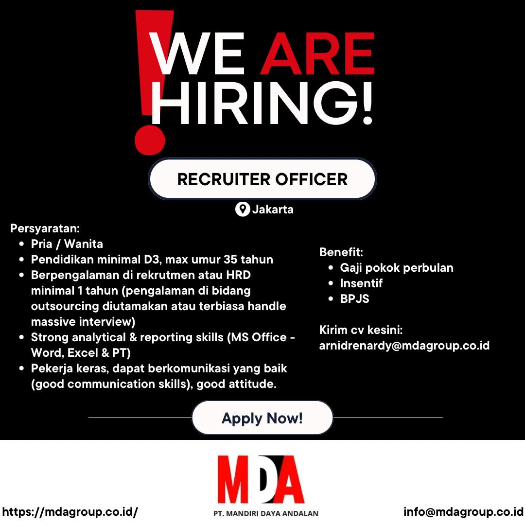 Saat ini PT. Mandiri Daya Andalan sedang membuka lowongan kerja recruitment Officer dengan kualifikasi sebagai berikut :?