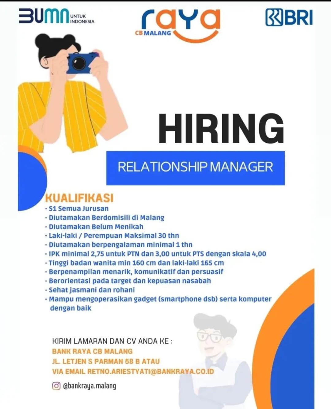 Jika anda berminat dengan lowongan kerja Relationship manager di Bank Raya Cabang Malang ini, segera kirimkan lamaran anda ke email :