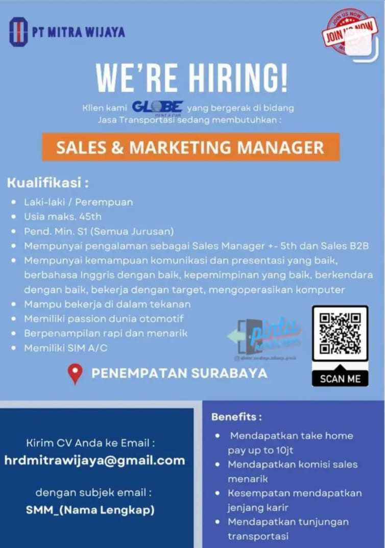 Saat ini PT. Mitra Wijaya sedang membuka lowongan pekerjaan sales & marketing manager dengan kualifikasi sebagai berikut :?