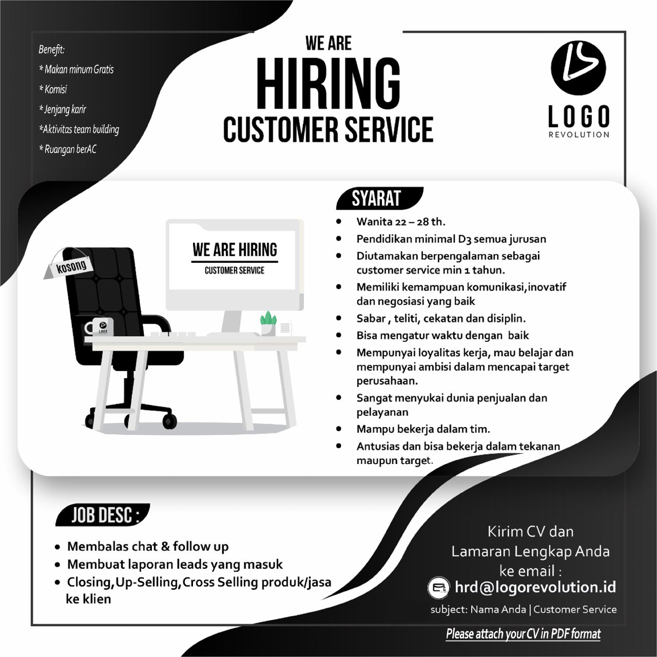Kirim CV dan Lamaran Lengkap Anda ke email : hrd@logorevolution.id dengan subject: Nama Anda | Customer Service dalam format PDF.