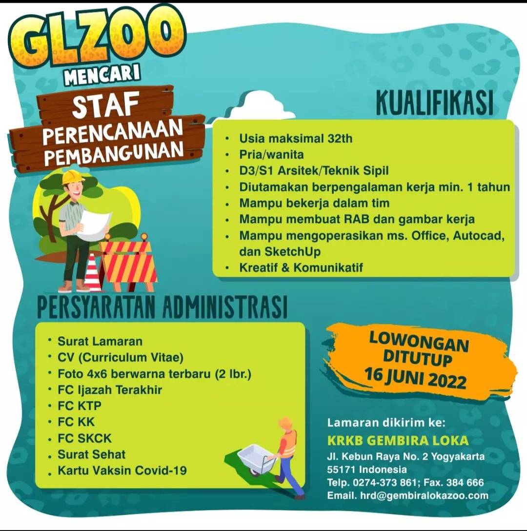 Jika anda berminat dengan lowongan kerja sebagai staff perencanaan pembangunan di GLZOO ini, segera kirimkan CV terbaru anda dan berkas pendukung lainnya ke email: hrd@gembiralokazoo.com